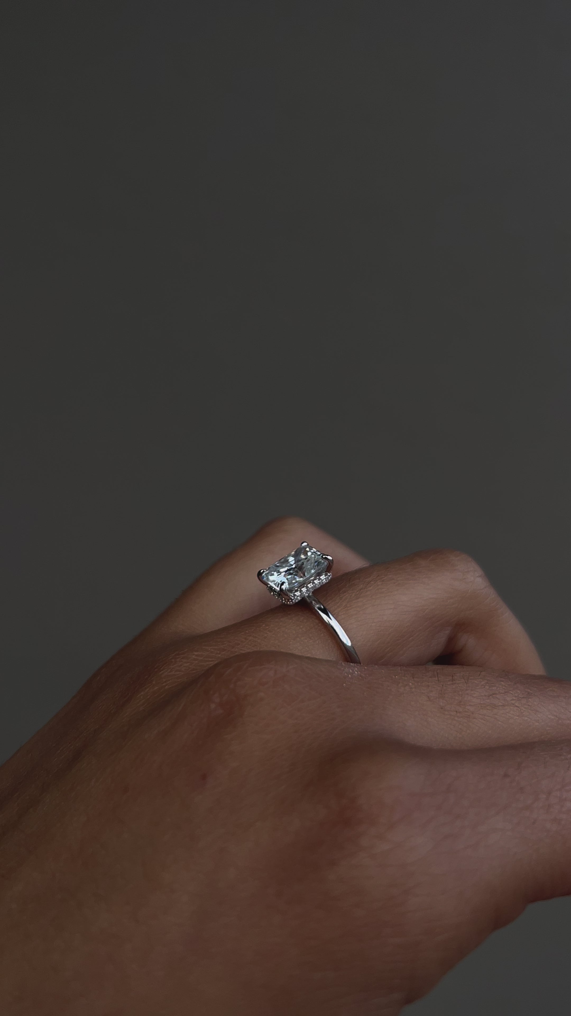 Introducing Amanda, the stunning 3ct Radiant cut moissanite engagement ring with a solitaire band and hidden halo. Available in 1.8mm 9ct gold, or 18ct gold, this ring is designed to make a statement. With its timeless elegance and exceptional sparkle, Charlotte is the perfect symbol of your love and commitment. Order yours today and start your forever with Charlotte.