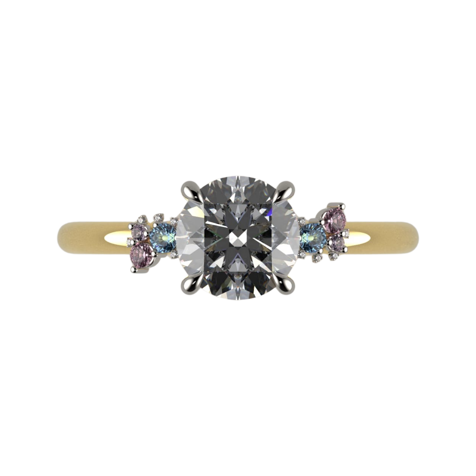 Set on a beautifully crafted 9ct gold band, this ring features an exquisite accent cluster of vibrant sapphires and delicate light pink Moissanites. The rich blue of the sapphires beautifully contrasts with the soft blush of the pink stones, creating a harmonious and eye-catching design that adds a touch of colour to your look.