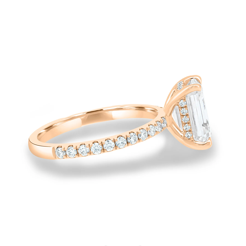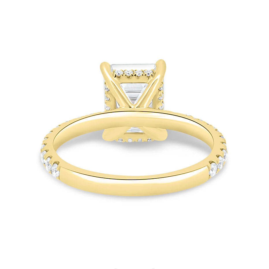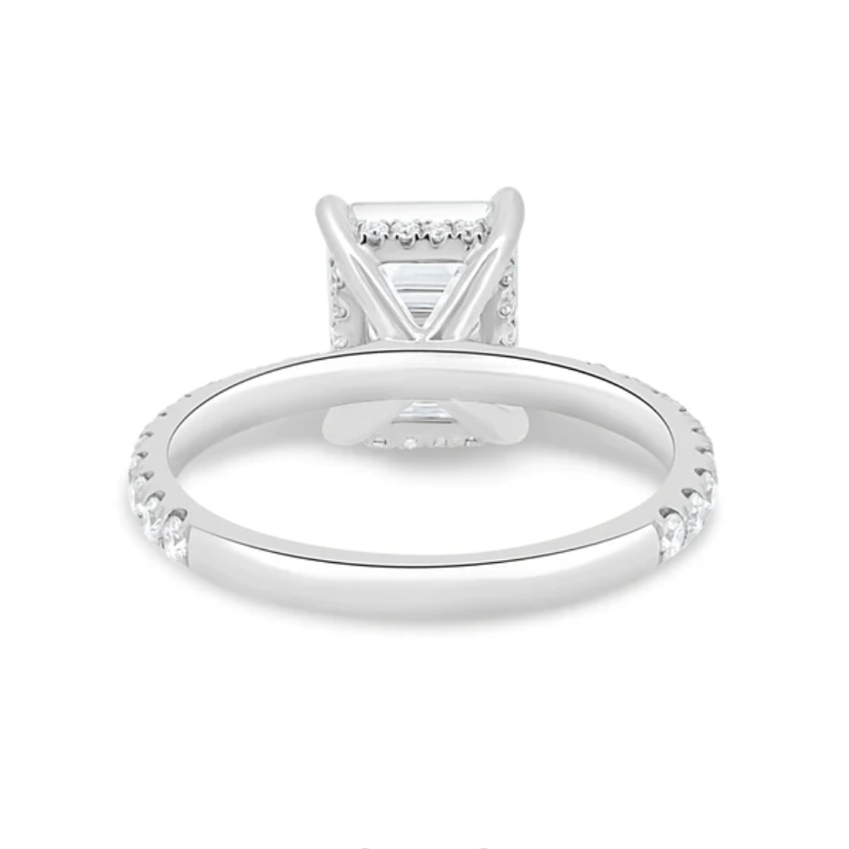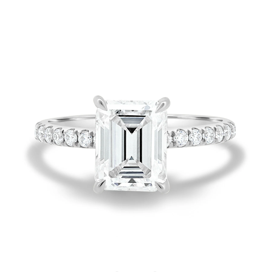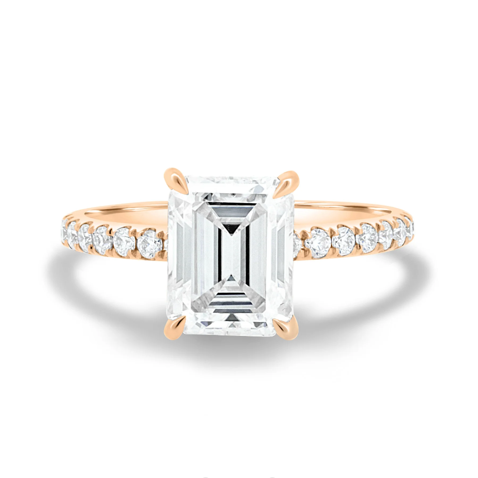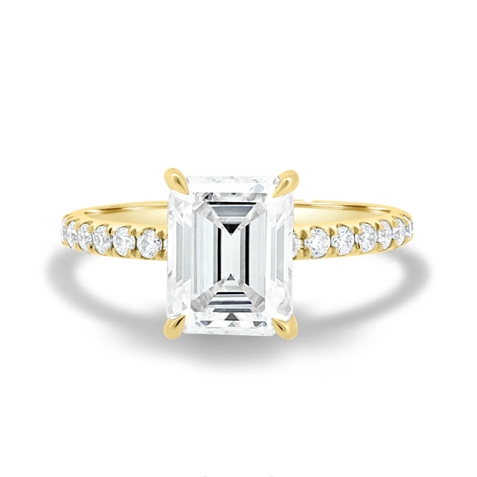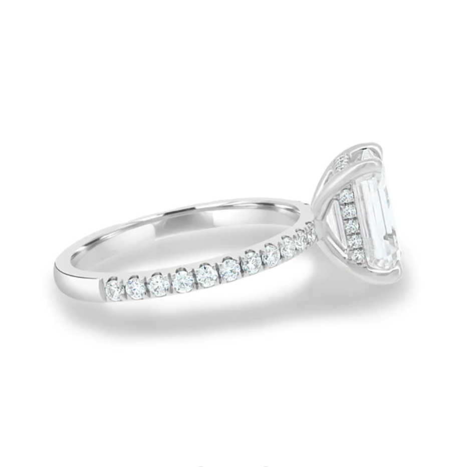 Introducing Genesis, a stunning 3ct emerald cut moissanite engagement ring that is sure to take your breath away. Featuring a hidden halo and pavé setting, this ring is the perfect combination of elegance and sparkle. Available in 2mm  9ct gold, or 18ct gold, you can choose the perfect metal to suit your taste and budget.