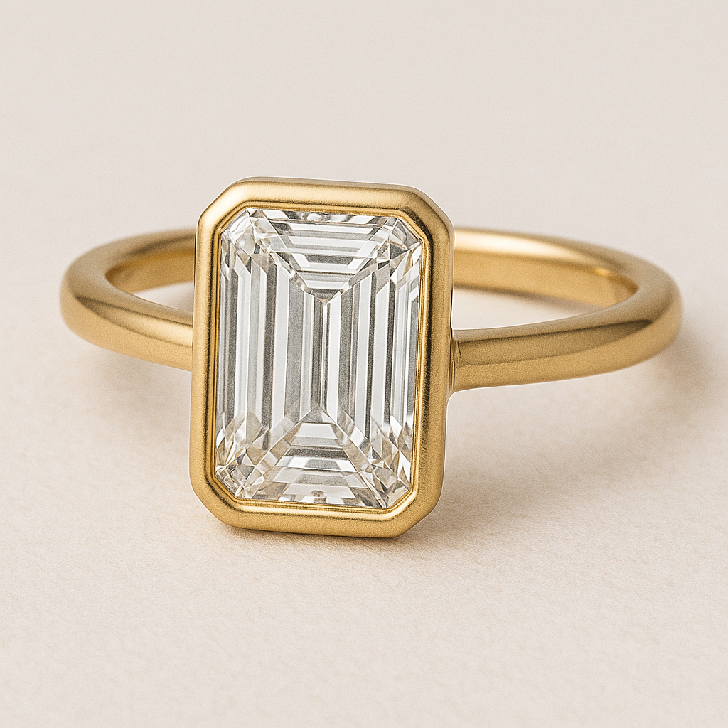 Introducing the stunning Imaan engagement ring, featuring a brilliant 1.5ct bezel-set emerald cut moissanite on a sleek solitaire band. Available in your choice of 2mm 9ct gold, or 18ct gold. This ring is a true showstopper, perfect for those seeking both elegance and affordability.