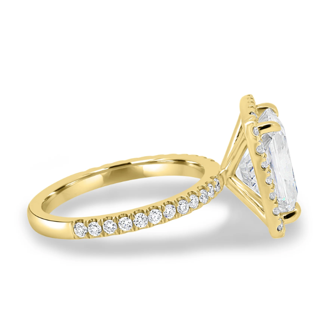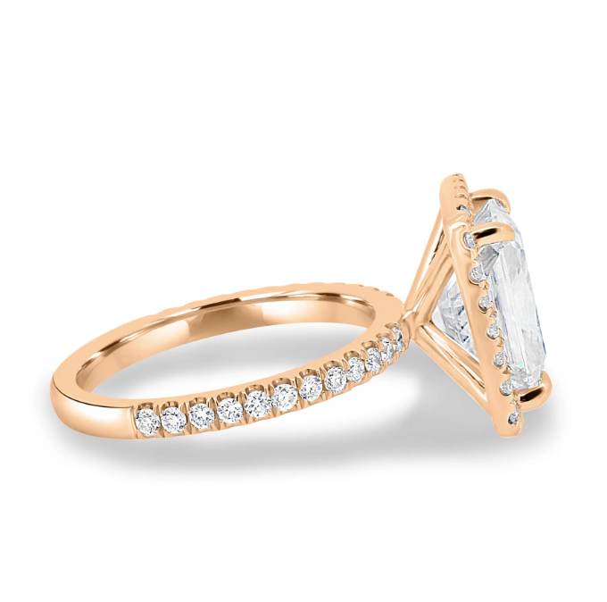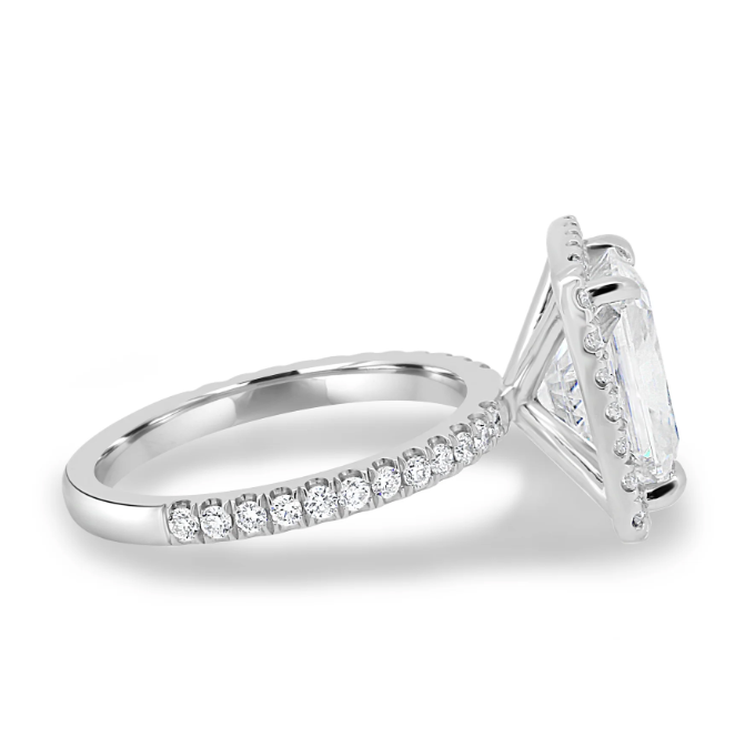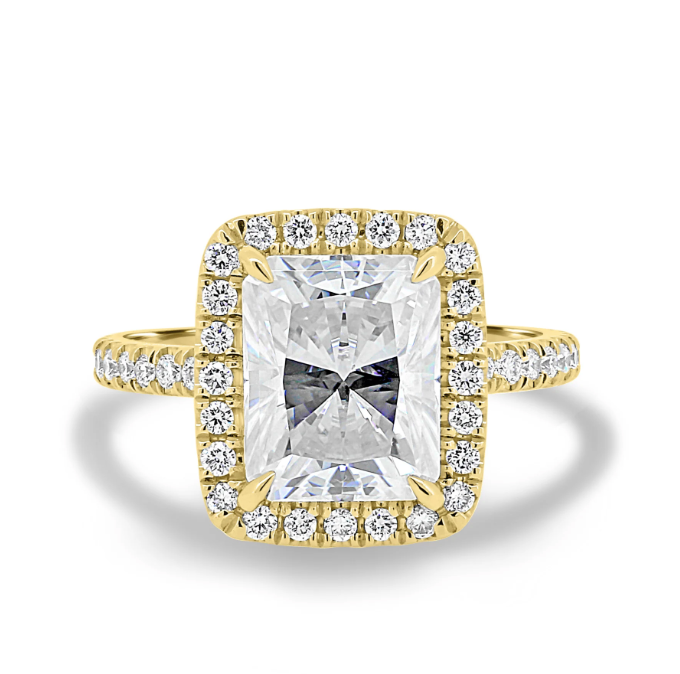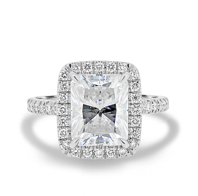 Introducing Casey, a stunning 4ct Radiant moissanite engagement ring with a sparkling pavé band and halo. Available in your choice of 925 sterling silver, 9ct gold, or 18ct gold with a classic 2mm band, this ring is the perfect symbol of your love and commitment. Its timeless design and superior quality make it a cherished piece for years to come.