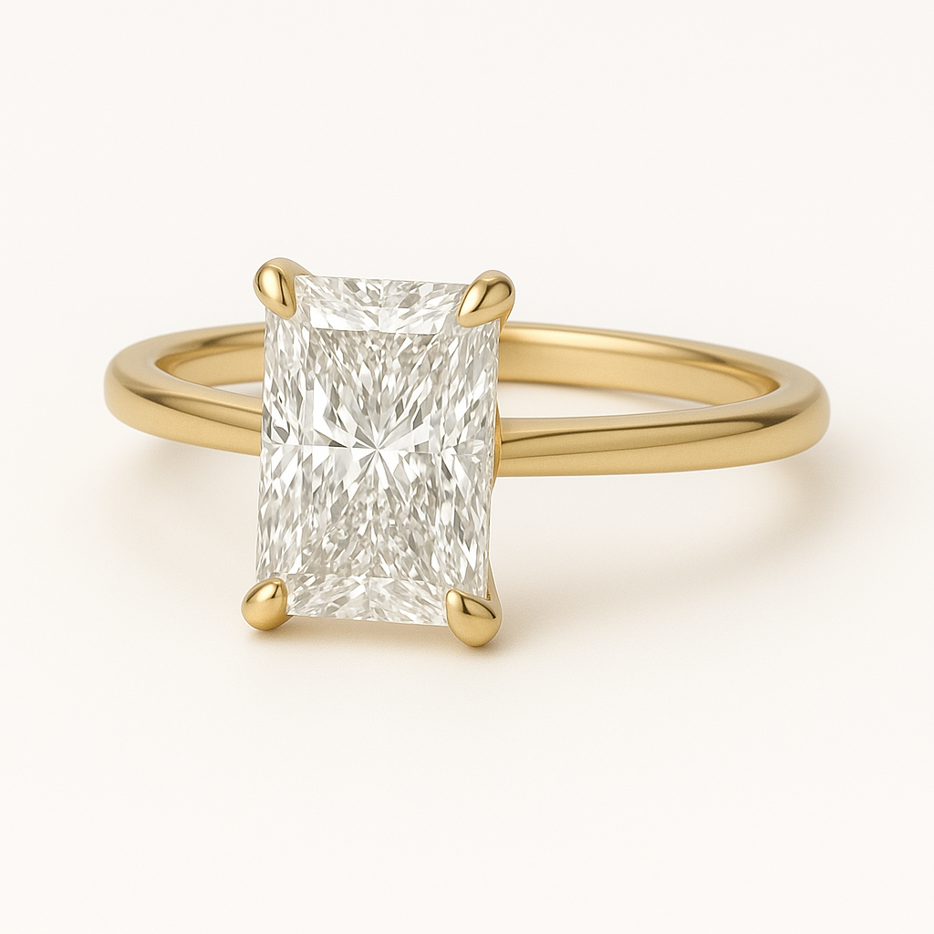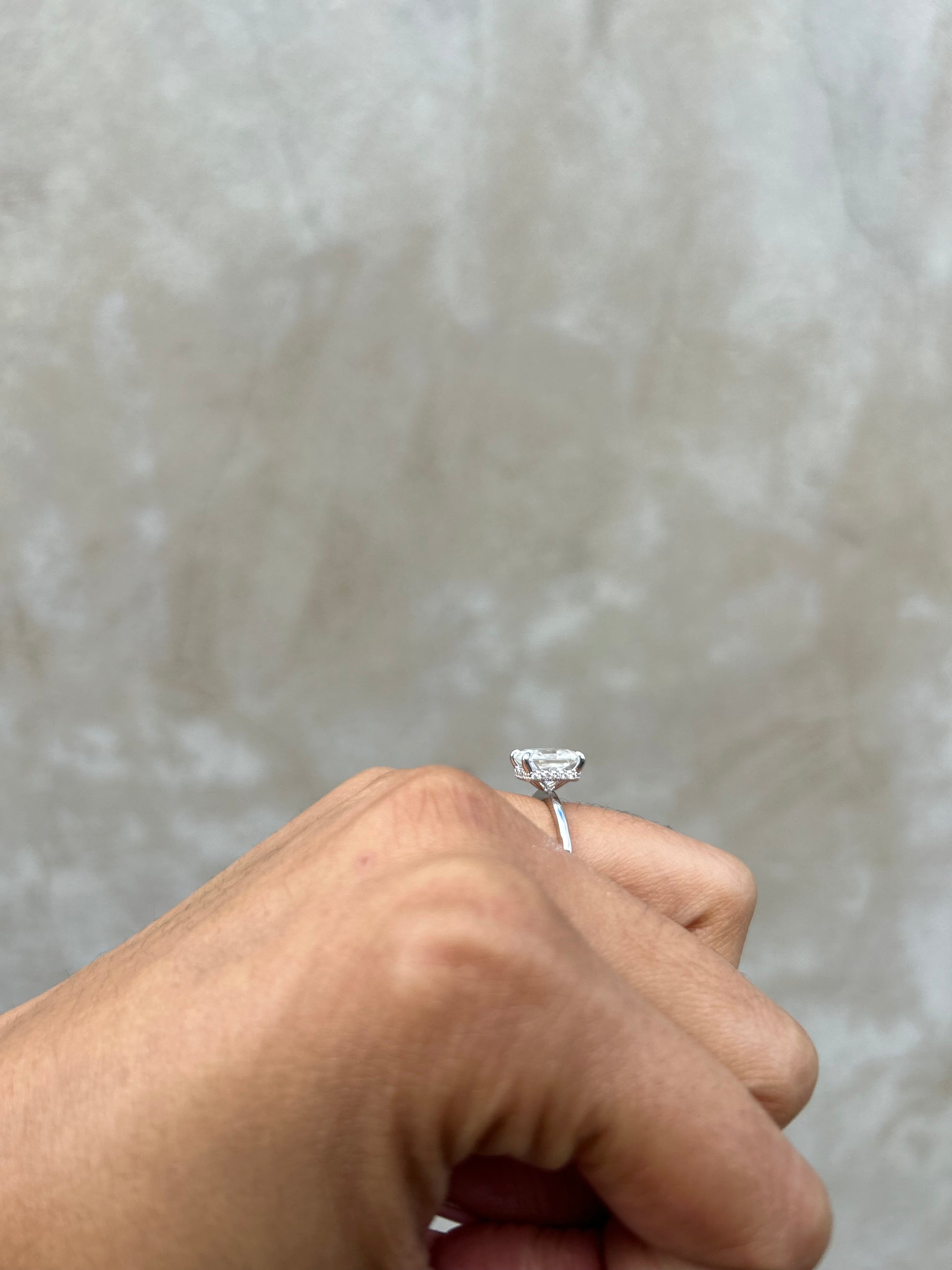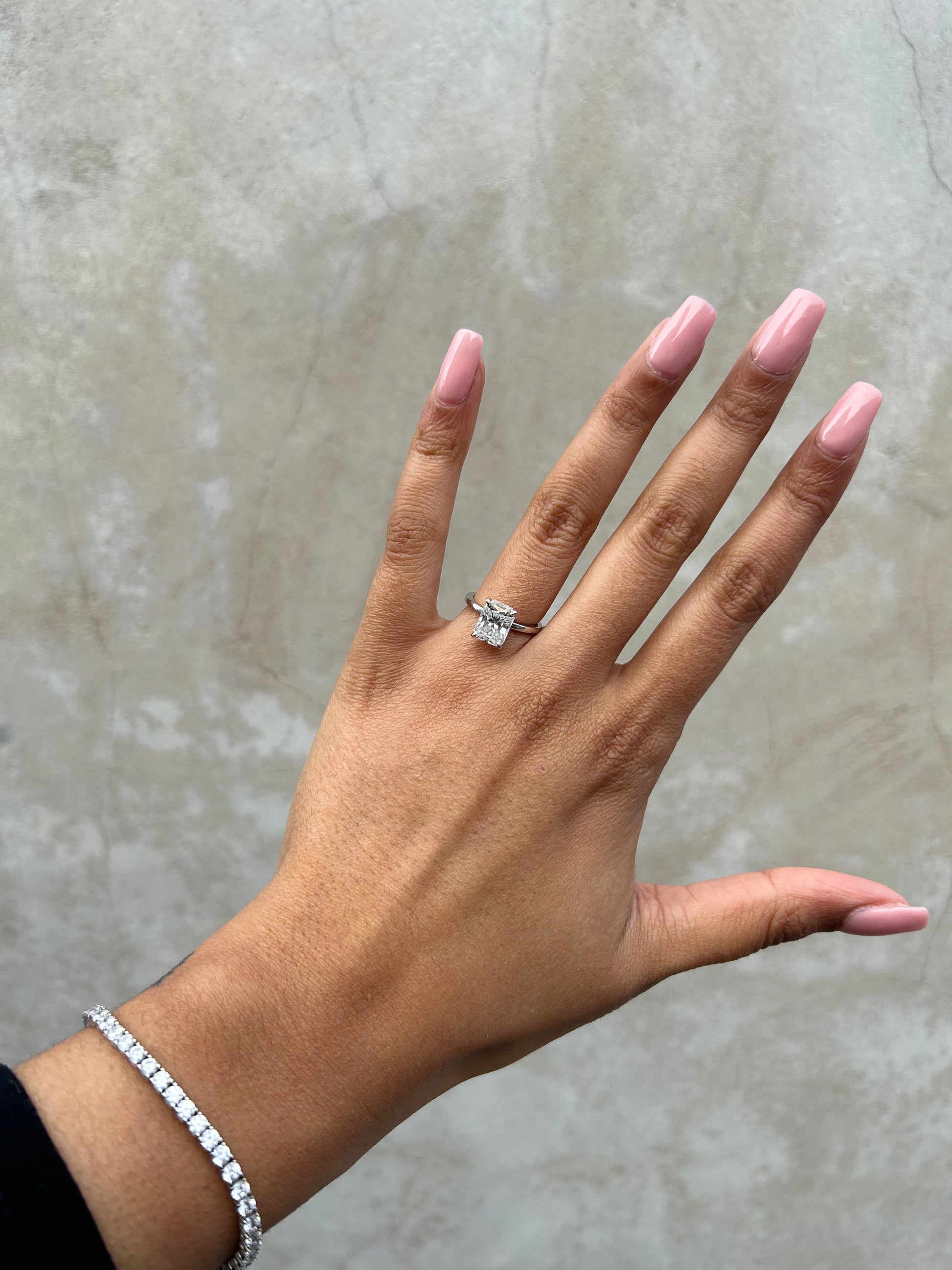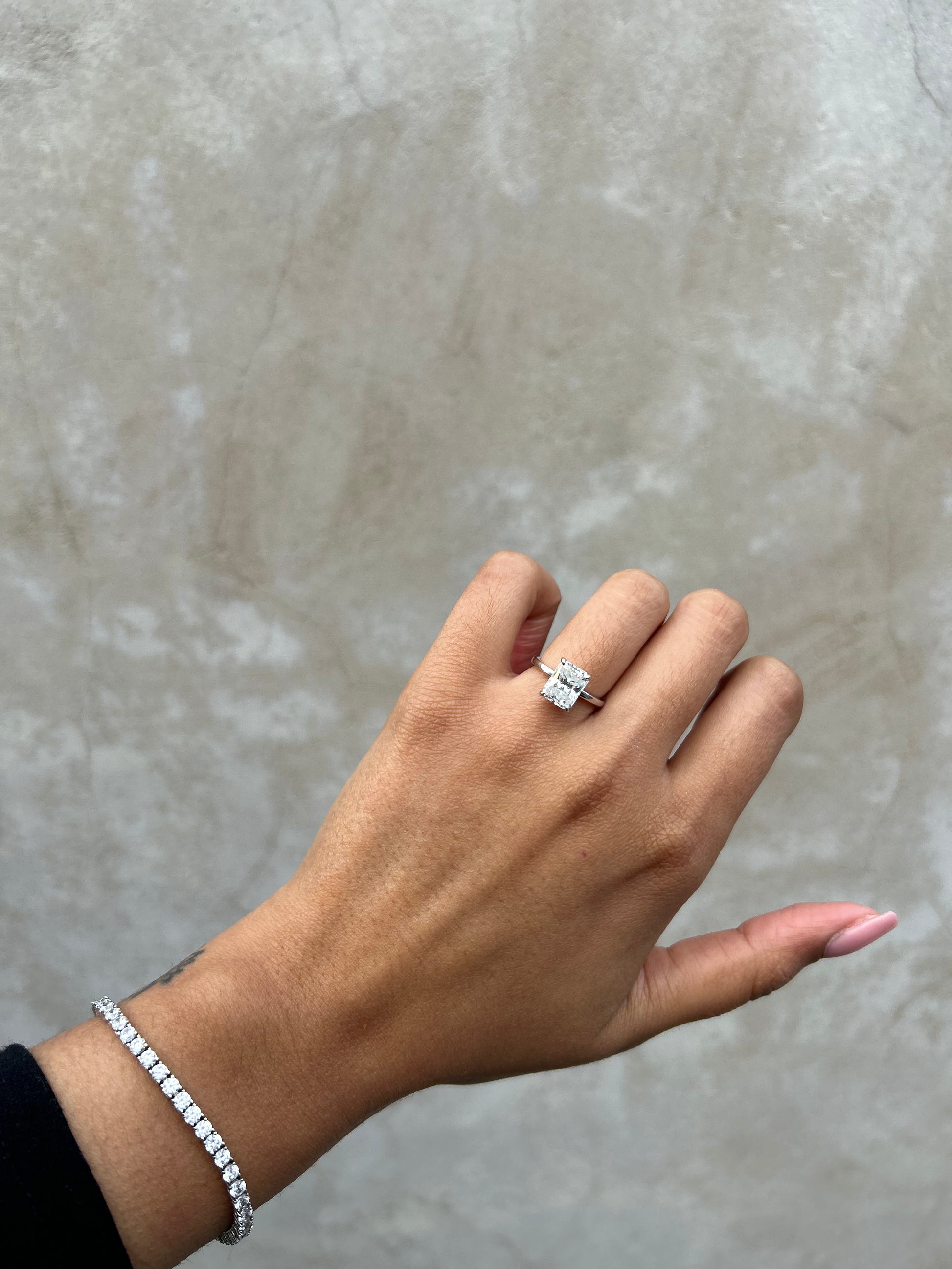 Introducing Amanda, the stunning 3ct Radiant cut moissanite engagement ring with a solitaire band and hidden halo. Available in 1.6mm 925 sterling silver, 9ct gold, or 18ct gold, this ring is designed to make a statement. With its timeless elegance and exceptional sparkle, Charlotte is the perfect symbol of your love and commitment. Order yours today and start your forever with Charlotte.