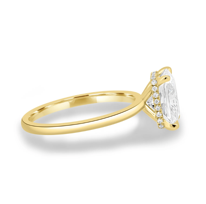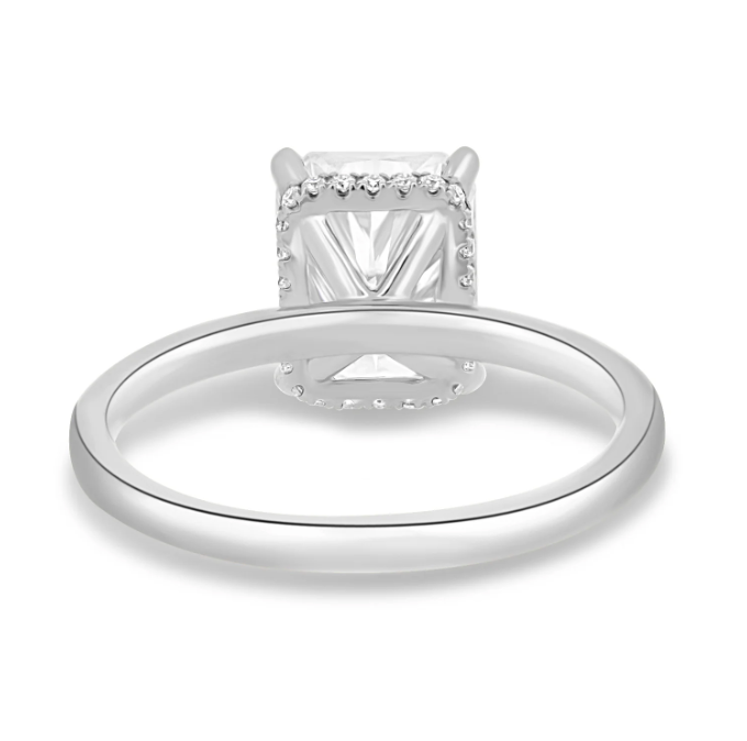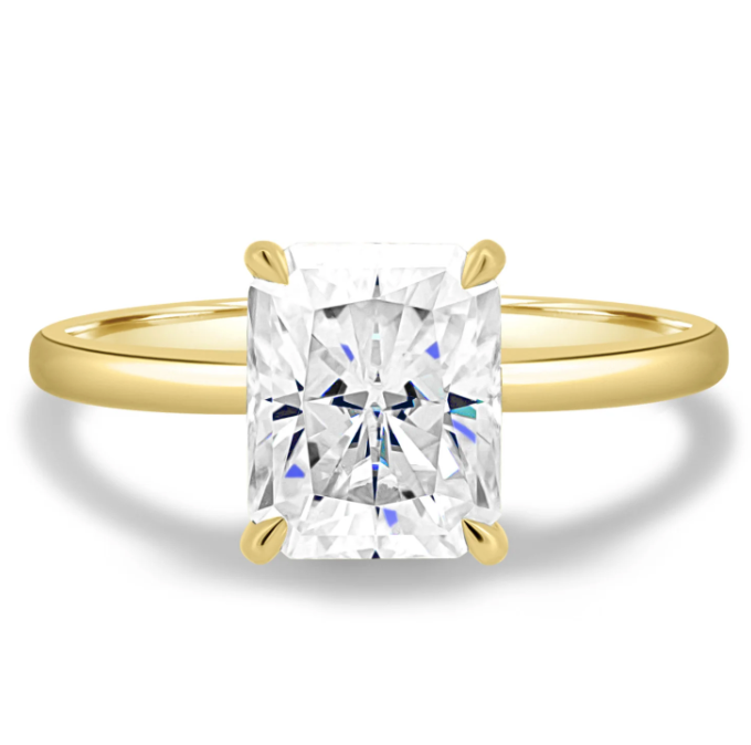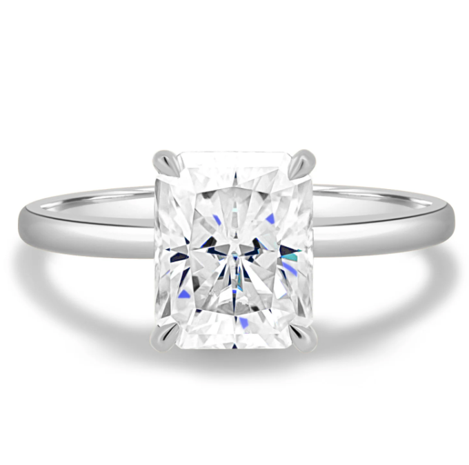 Introducing Leanna, the perfect engagement ring for the modern couple. With a stunning 4ct Radiant cut moissanite stone, Leanna is sure to turn heads. The solitaire band and hidden halo design add a touch of elegance to this already stunning piece. Available in 1.8mm 925 sterling silver, 9ct gold, or 18ct gold, Leanna can be customized to fit any style and budget. Make a statement with Leanna and make your engagement unforgettable.