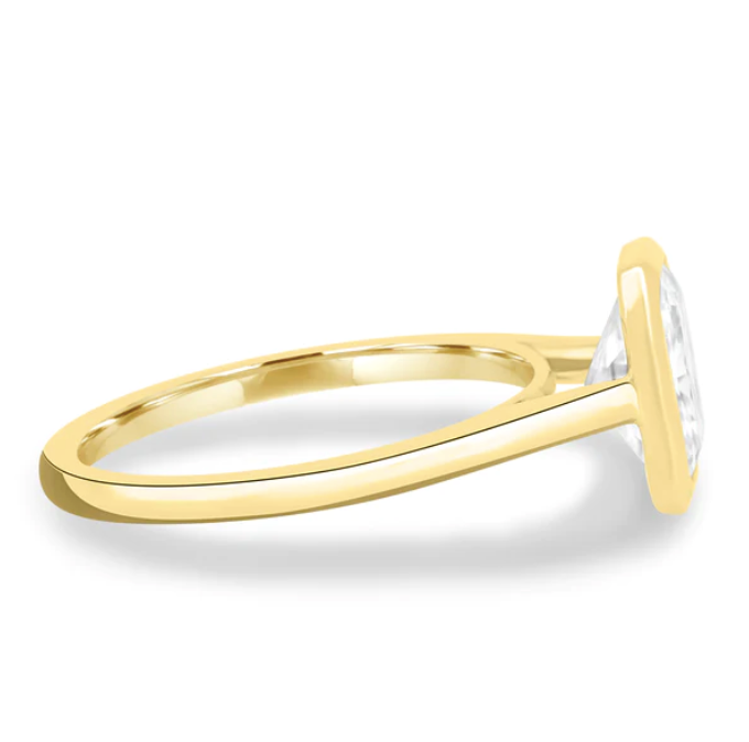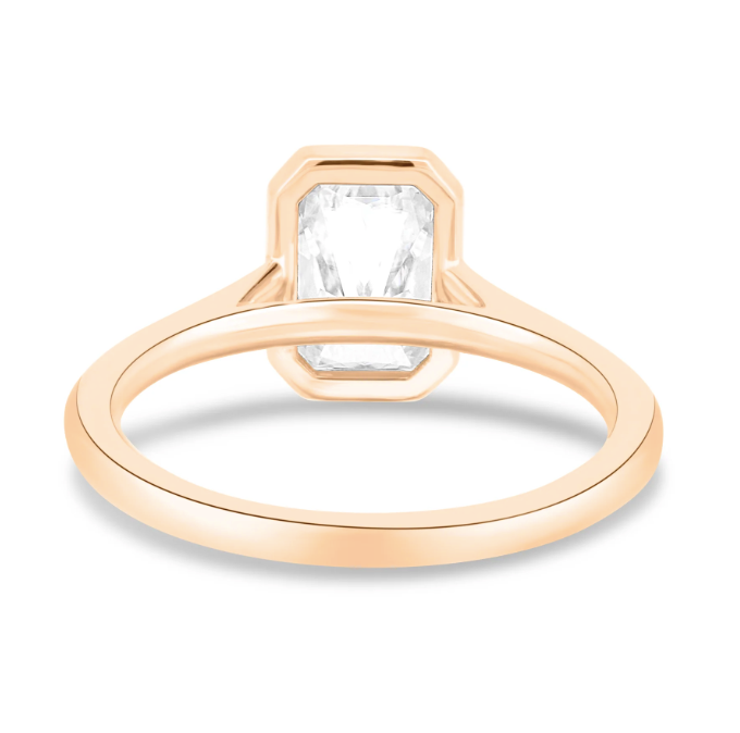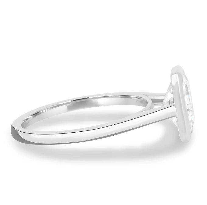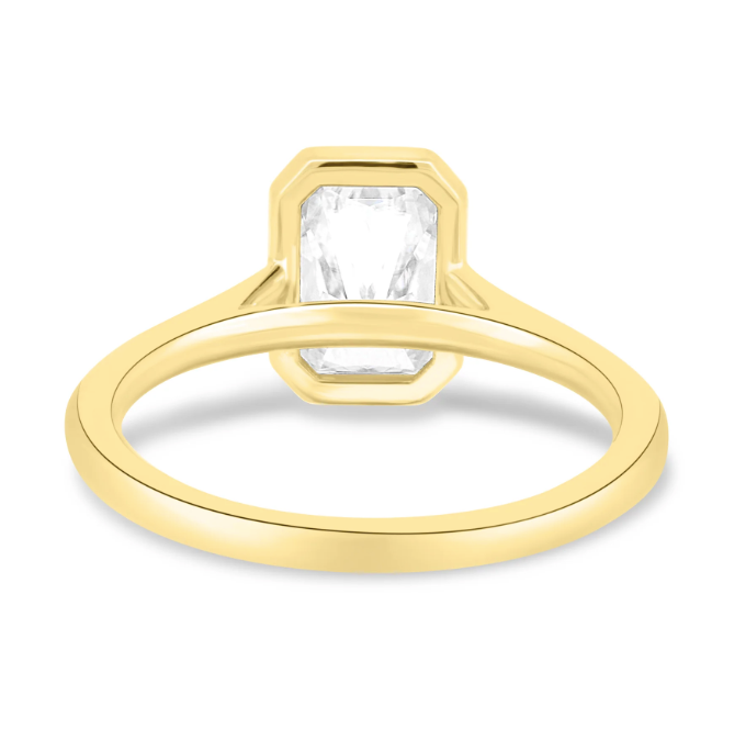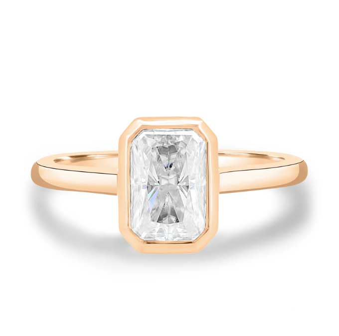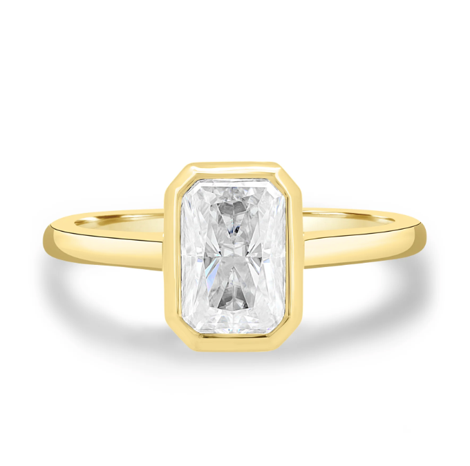 Introducing Razaan, the perfect engagement ring for those who want to make a bold statement. Featuring a stunning 2.40ct Bezeled-set Radiant cut moissanite, this ring is sure to turn heads. The solitaire band adds a touch of elegance, while the option to choose between 2mm 925 sterling silver, 9ct gold or 18ct gold ensures that there's a perfect match for any taste. Give your loved one a ring they'll treasure forever with Razaan.